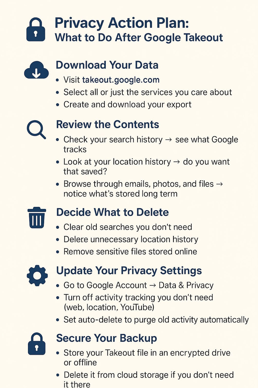 A clear guide to reviewing, deleting, and securing your Google Takeout data for stronger privacy.