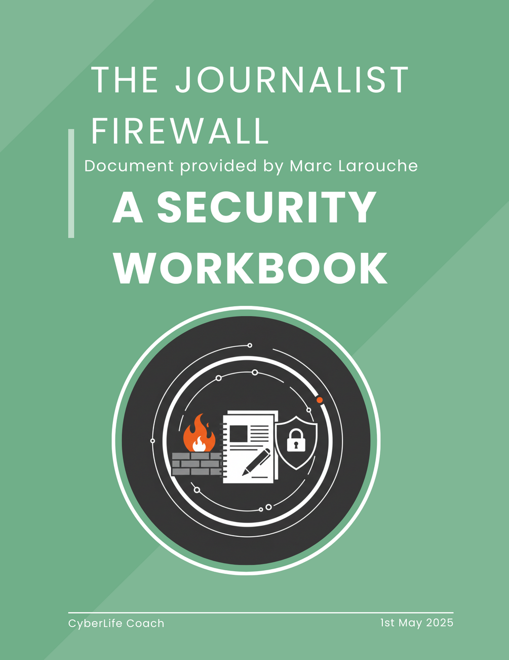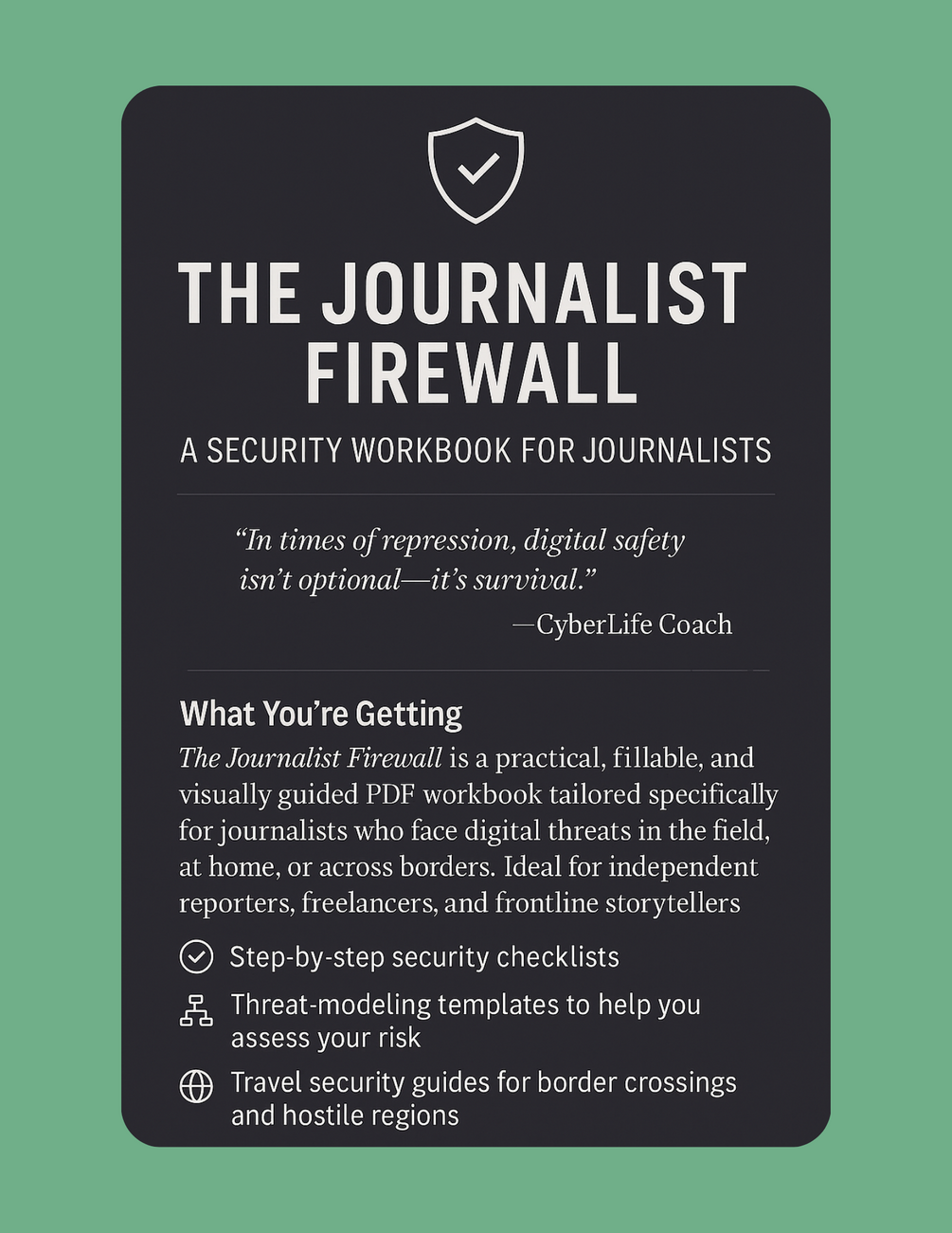 Just like a digital firewall protects a network, this workbook helps journalists defend what matters most — their sources, their stories, and their devices. In a world of growing surveillance and data risks, journalists need more than luck — they need tools. This guide is your personal firewall against digital threats: practical, printable, and field- ready. Packed with step-by-step checklists, threat modeling templates, travel prep strategies, and visual guides, it makes personal security approachable without sacrificing depth. Built by a cybersecurity expert and privacy coach, it's an essential resource for anyone reporting under pressure or seeking to safeguard their digital footprint.